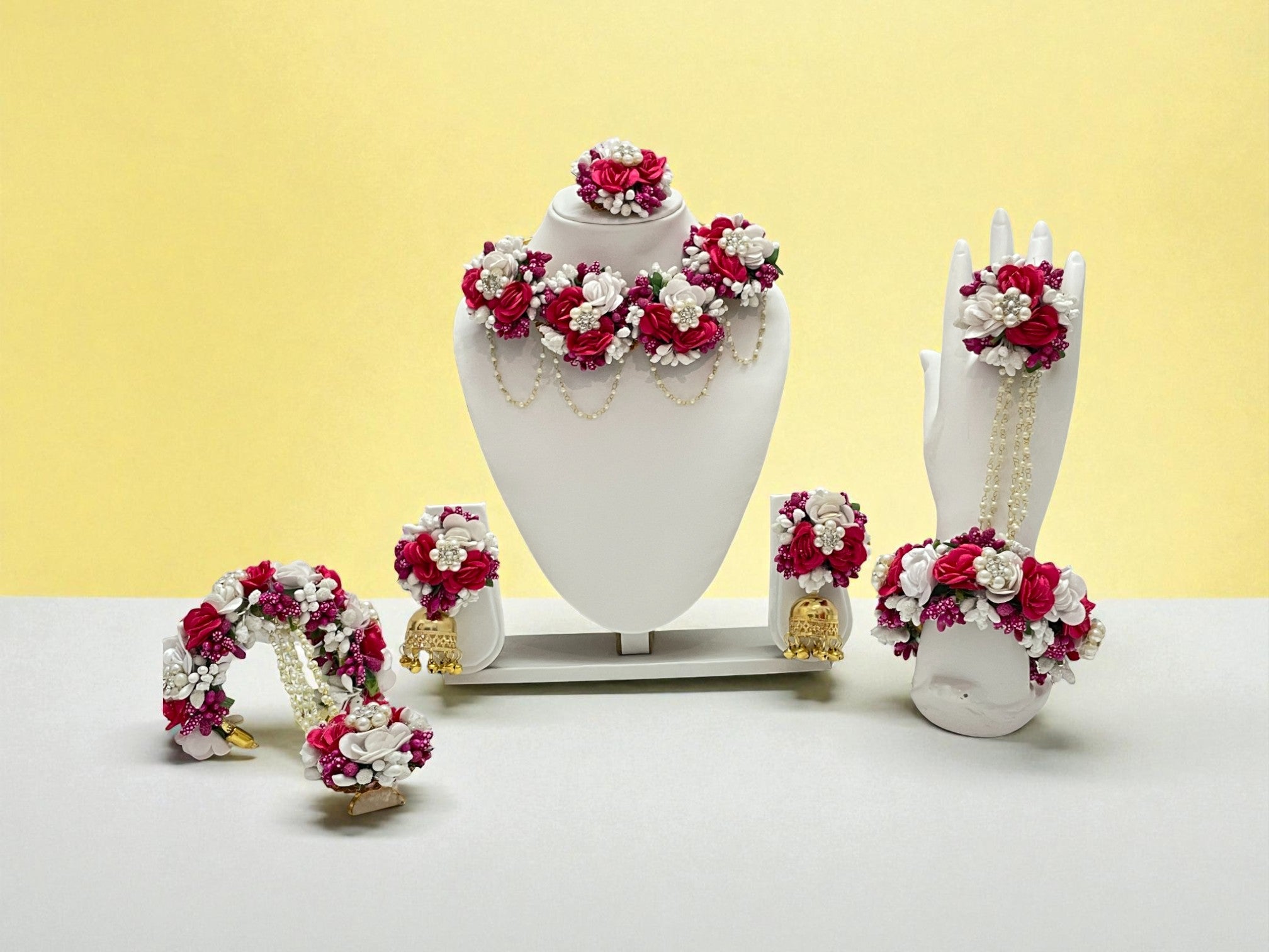 Step into your wedding festivities with this Blossom Charm Floral Jewellery Set, crafted in pink and white flowers with pearl accents. A perfect blend of tradition and elegance, this set is ideal for Haldi, Mehendi, or festive looks.