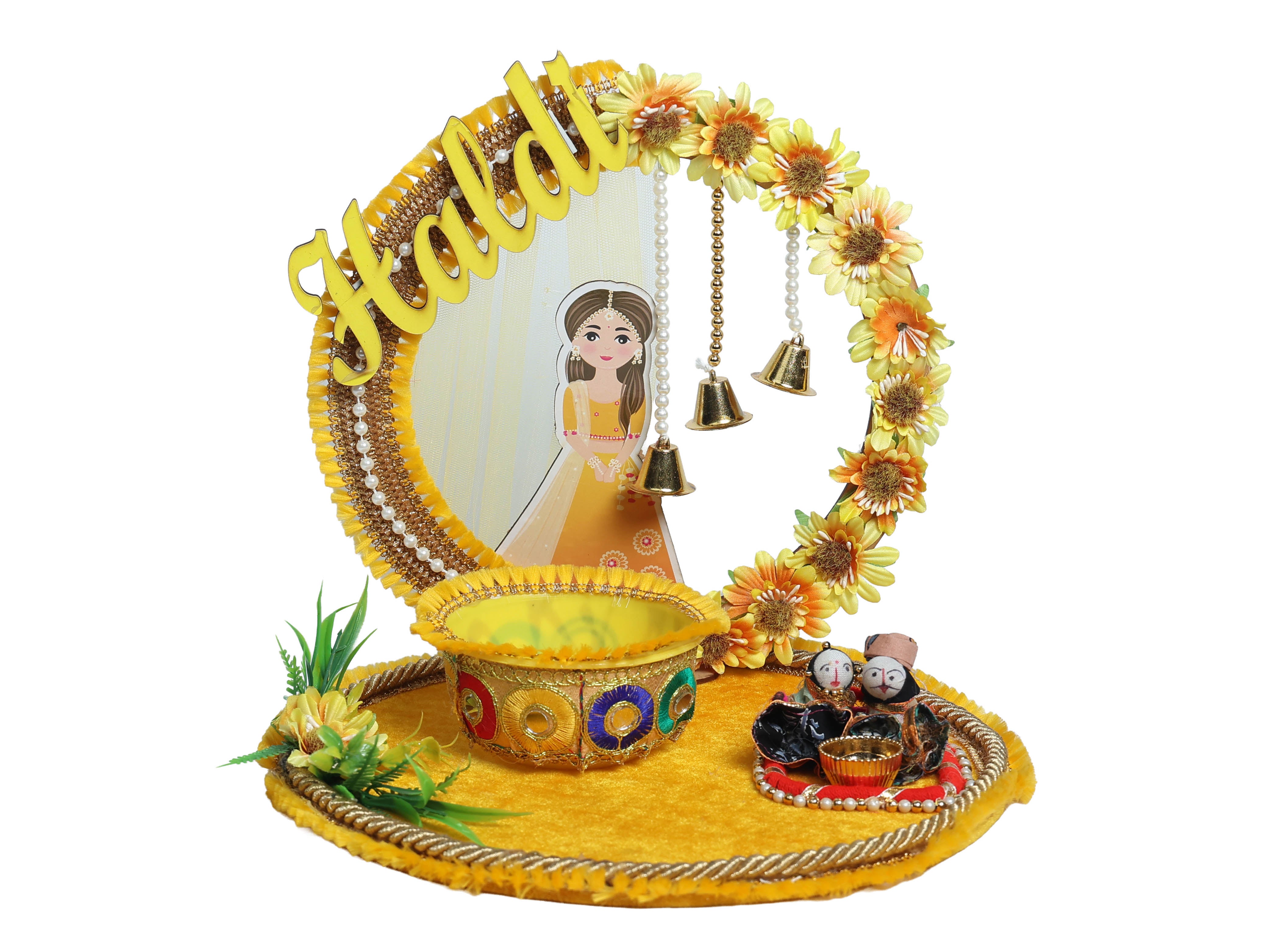 Add a festive burst of color and tradition to your pre-wedding rituals with this Handcrafted Haldi Ceremony Decorative Platter. Designed in cheerful yellow tones, this vibrant platter showcases a cute bride cut-out dressed in yellow, surrounded by artificial sunflowers and pearl embellishments.