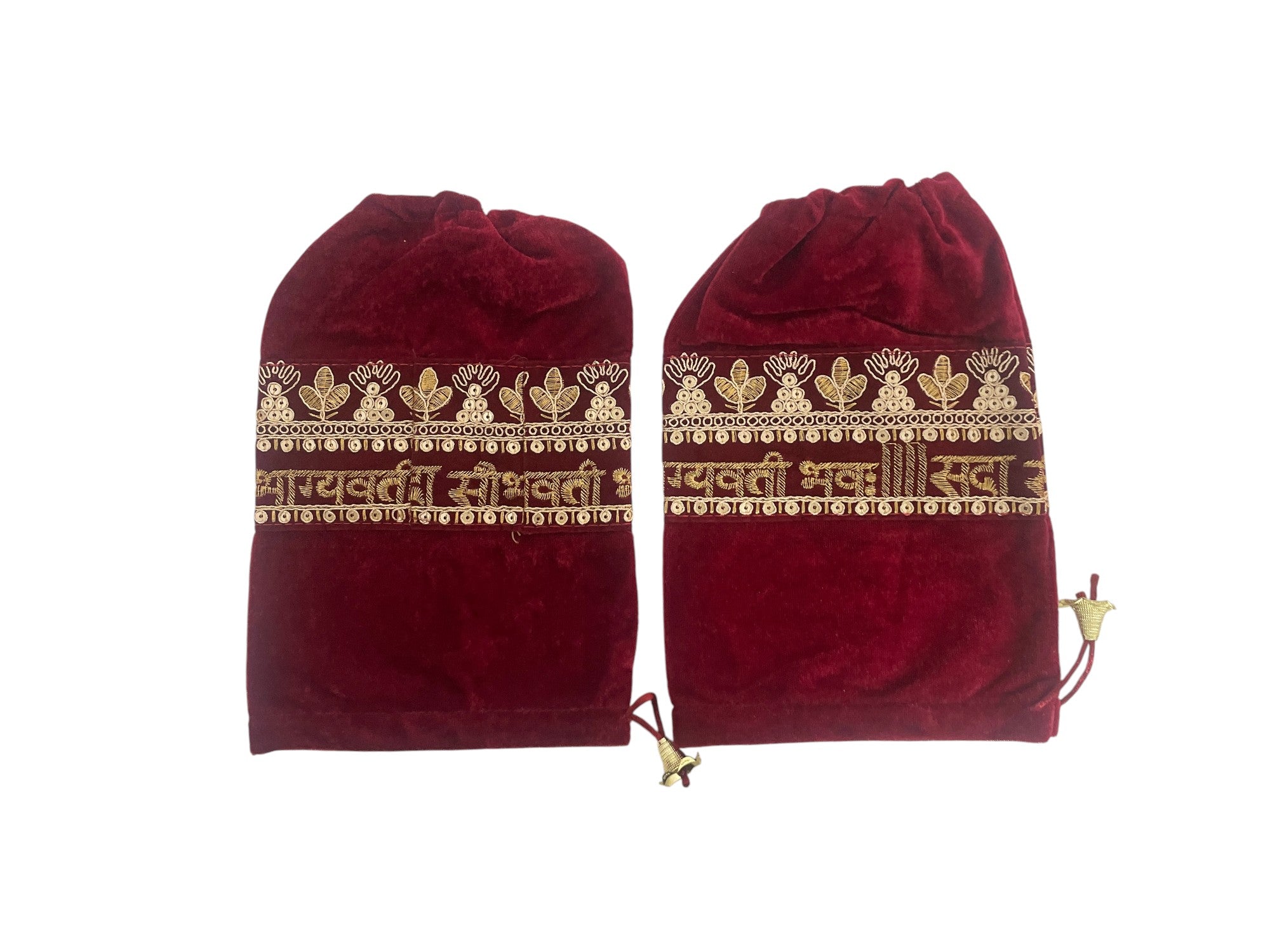 Add a touch of tradition and elegance to your bridal essentials with this beautifully crafted Chooda Cover. Made in Maroon red velvet fabric, this cover features intricate golden zari embroidery with auspicious motifs, making it perfect for preserving and adorning your bridal chooda in style.