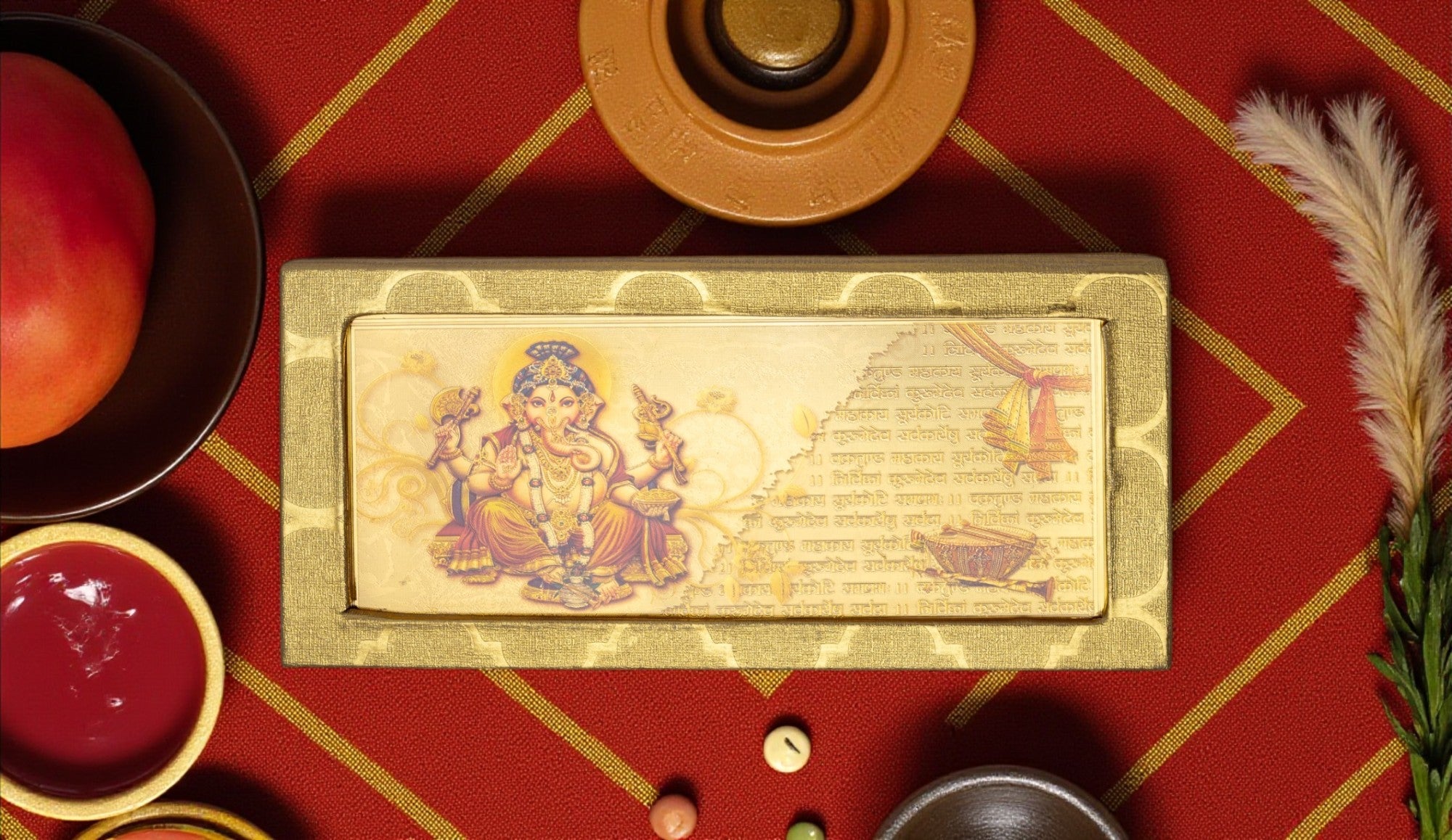 A divine gifting option featuring Lord Ganpati embossed in gold, symbolizing blessings and prosperity. Lined with red velvet inside, this box is both spiritual and luxurious.