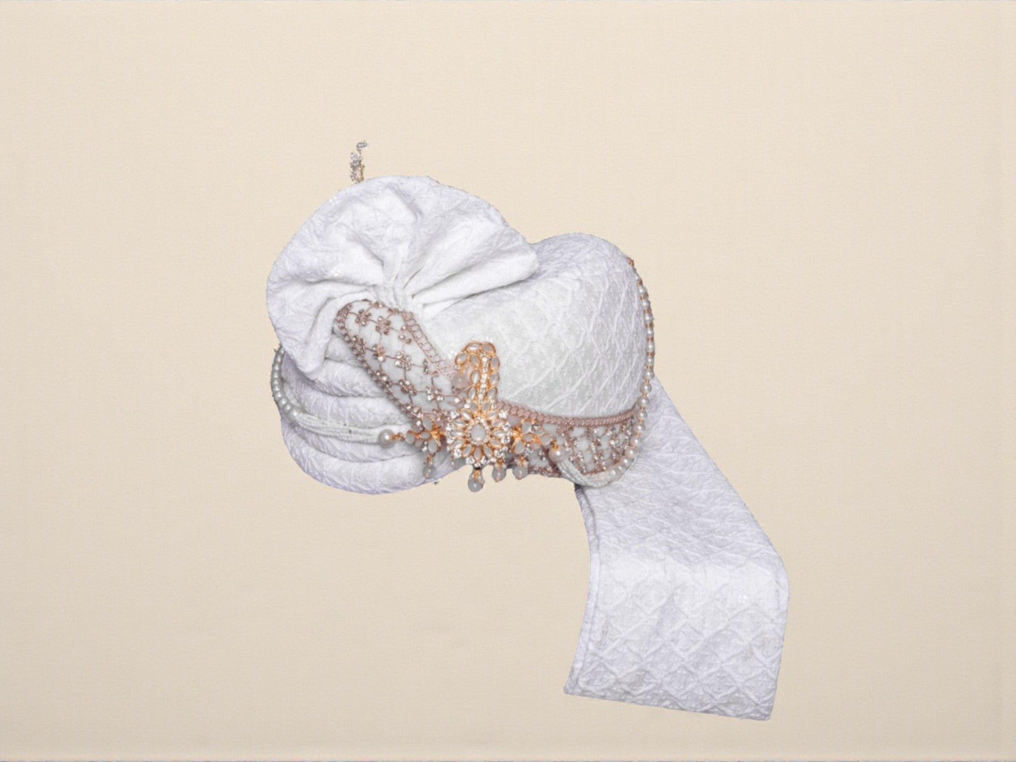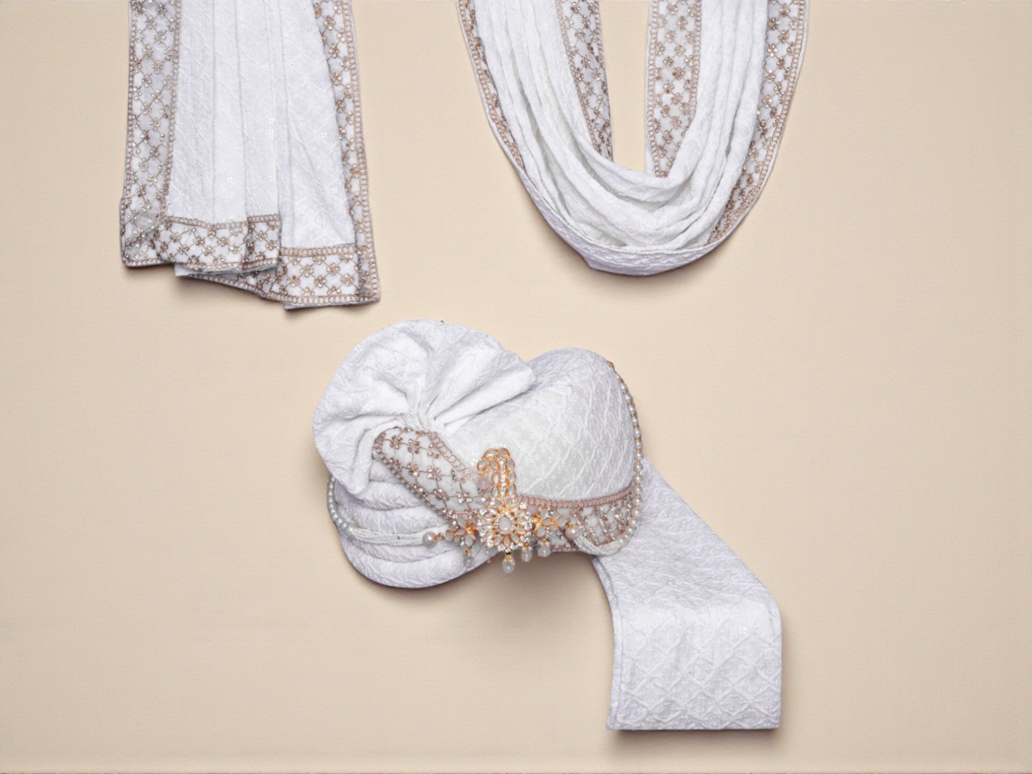 Keep it classy with this elegant white dulha pagdi set, complete with a matching safa and ornate kalgi. Crafted from premium fabric with golden embroidery, this regal ensemble ensures the groom stands out with timeless sophistication.
