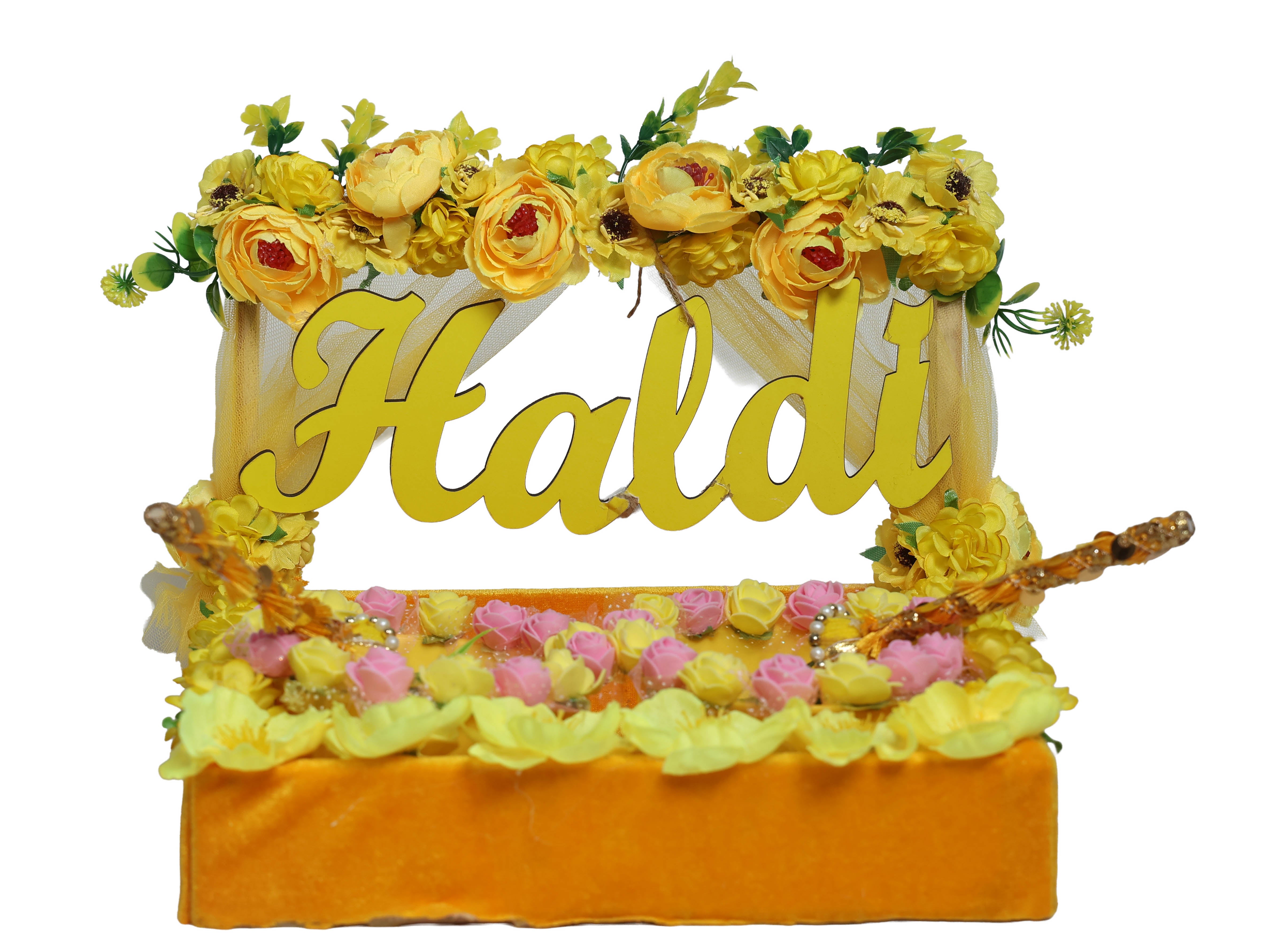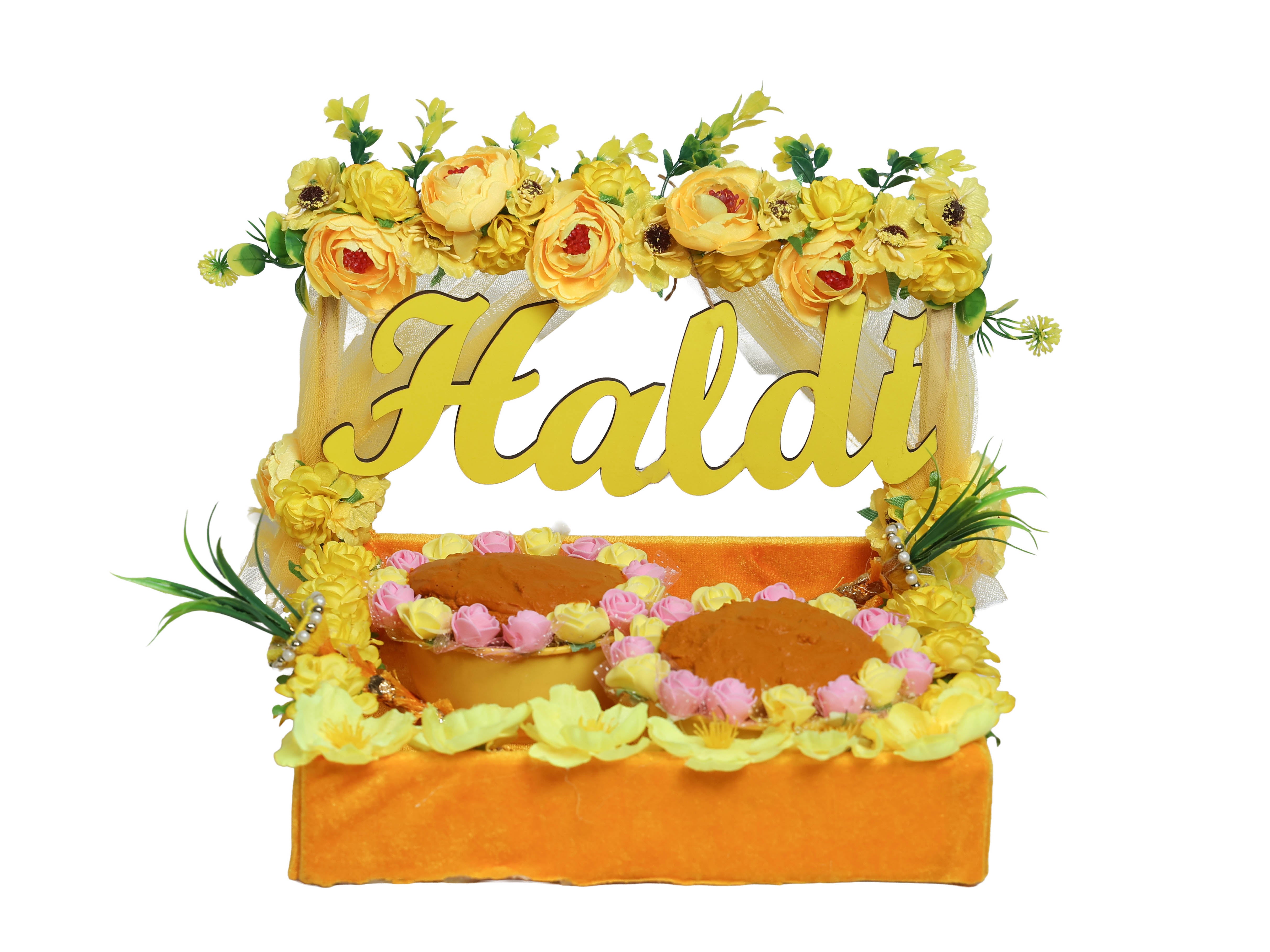Celebrate the vibrant spirit of Indian weddings with this stunning Haldi Platter, featuring a beautifully crafted yellow floral arch, twin haldi holders, and ornamental Kalash accents. Perfect for bridal ceremonies, this platter brings elegance and tradition together.