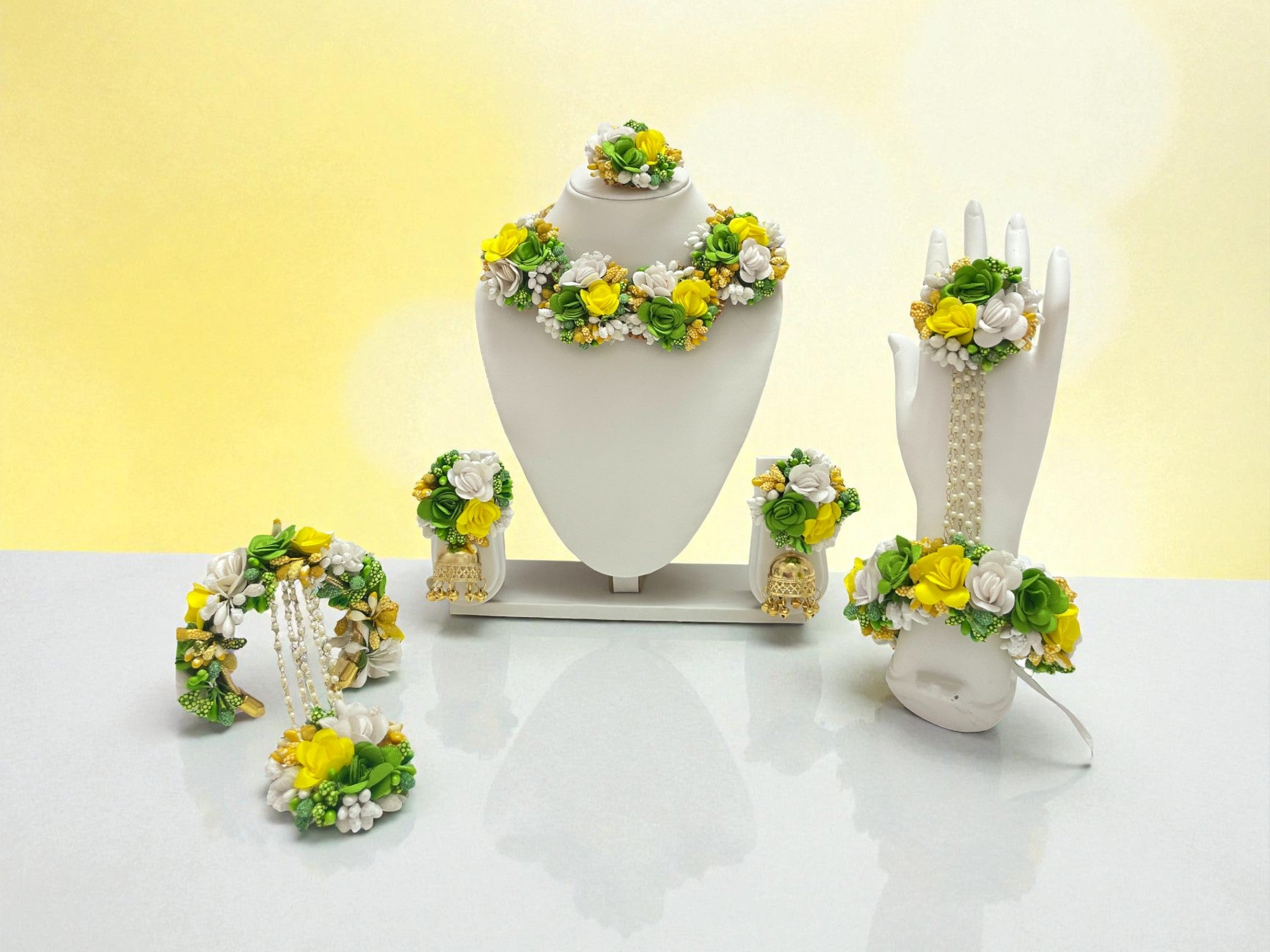 Enhance your feminine charm with this Grace Bloom Bridal Floral Jewellery Set in soft pink with yellow flower accents and pearls. Lightweight and elegant, it’s the perfect choice for Haldi, Mehendi, and Baby Shower celebrations.