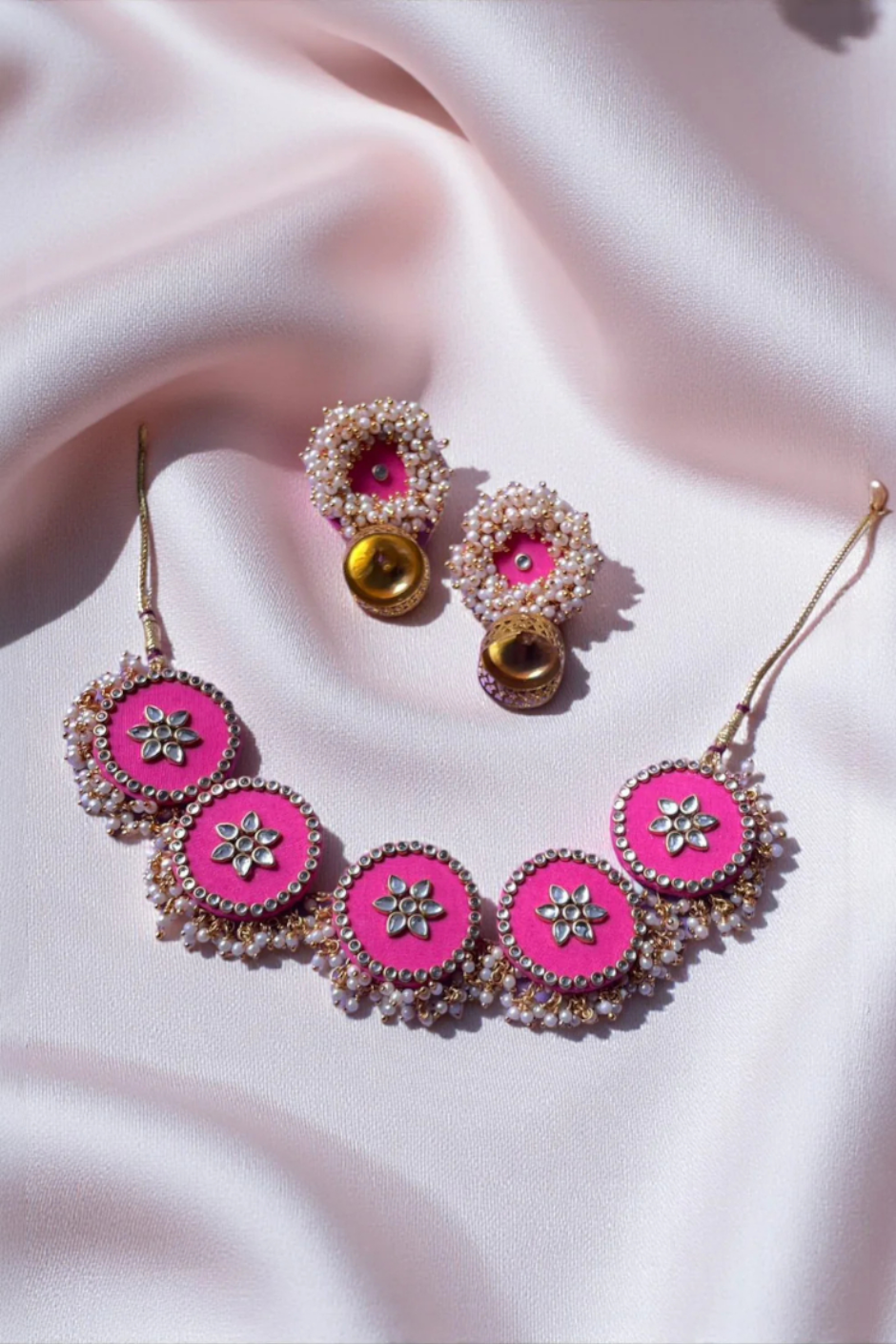 Add a burst of elegance and colour to your pre-wedding celebrations with this beautifully handcrafted pink fabric jewellery set. Adorned with intricate kundan floral motifs, delicate mini pearl hangings, and shimmering gold detailing, this set brings a graceful blend of traditional craftsmanship and modern festive charm.