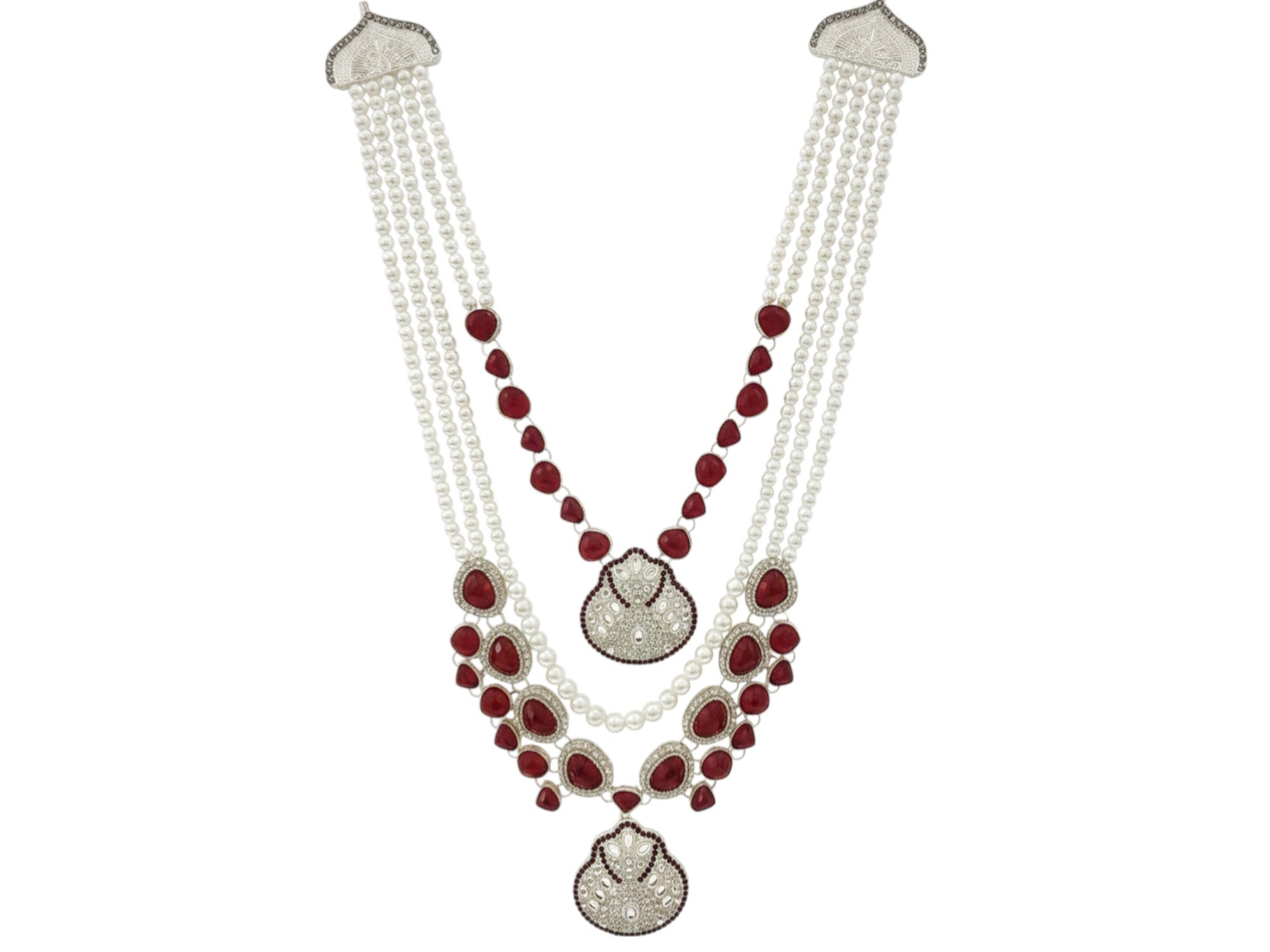 Design: A sophisticated double-strand composition. The inner strand features a single row of red stones, while the outer layer is a heavy, multi-layered pearl chain (Moti Mala) leading to a statement bib-style centerpiece.