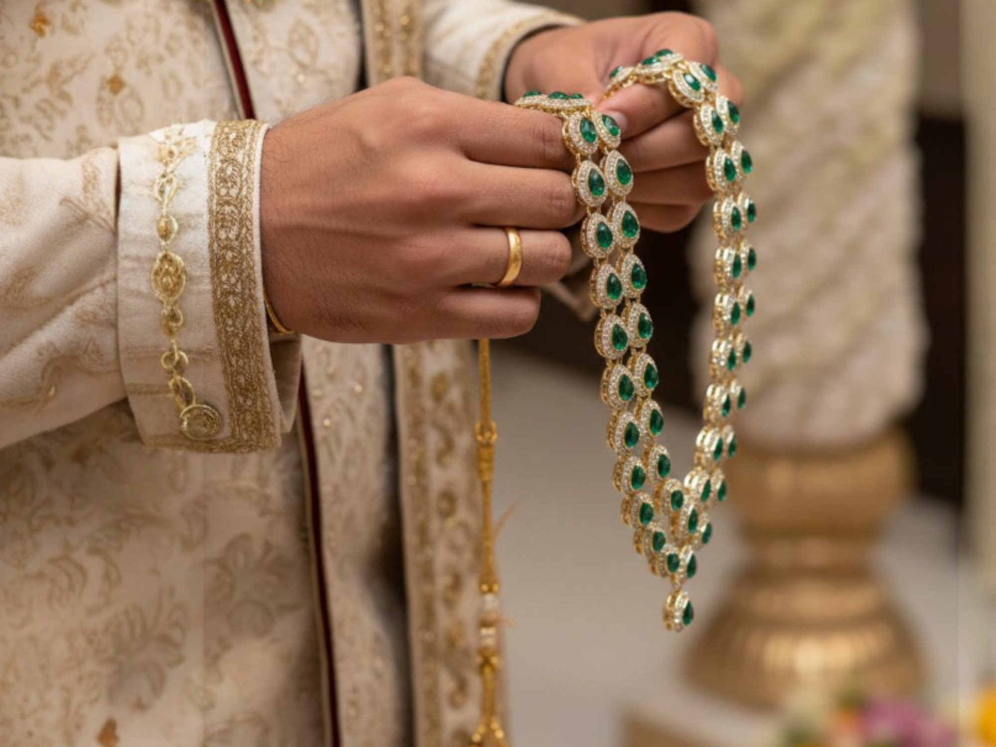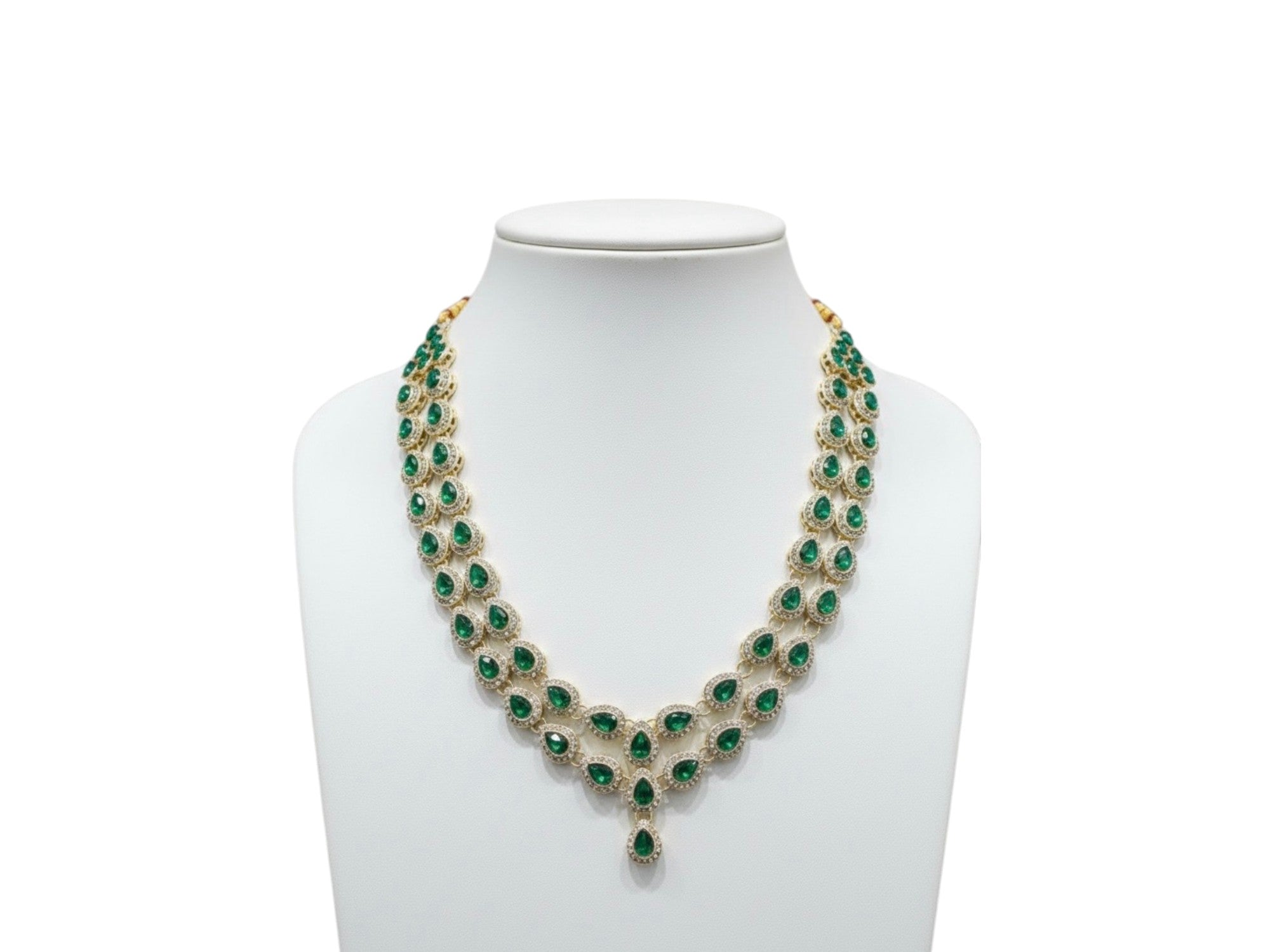 Elevate the groom’s wedding look with this regal emerald-toned groom mala, crafted to exude timeless royalty and grandeur. Designed with striking teardrop-shaped green stones bordered by shimmering crystal detailing, this mala adds a rich, traditional charm to sherwani and achkan ensembles. The layered layout and elegant central drop create a statement silhouette, making it perfect for weddings, receptions, and royal-themed ceremonies. Lightweight yet luxurious in appearance, this groom mala offers a premium look without compromising on comfort—ideal for the modern groom who wants classic elegance with effortless style.