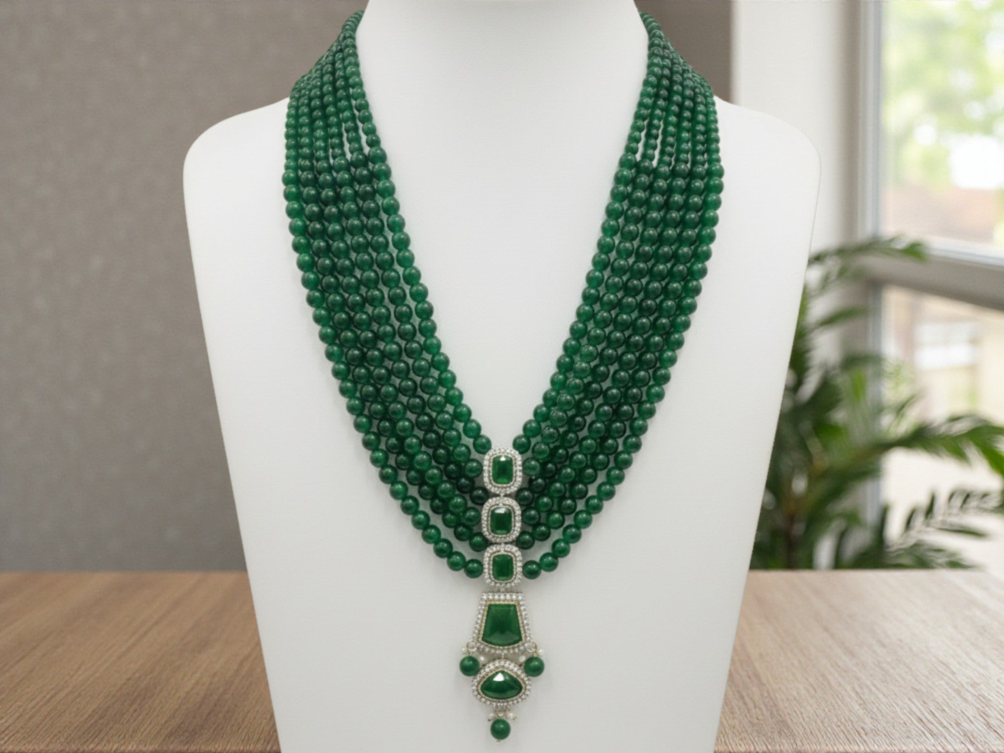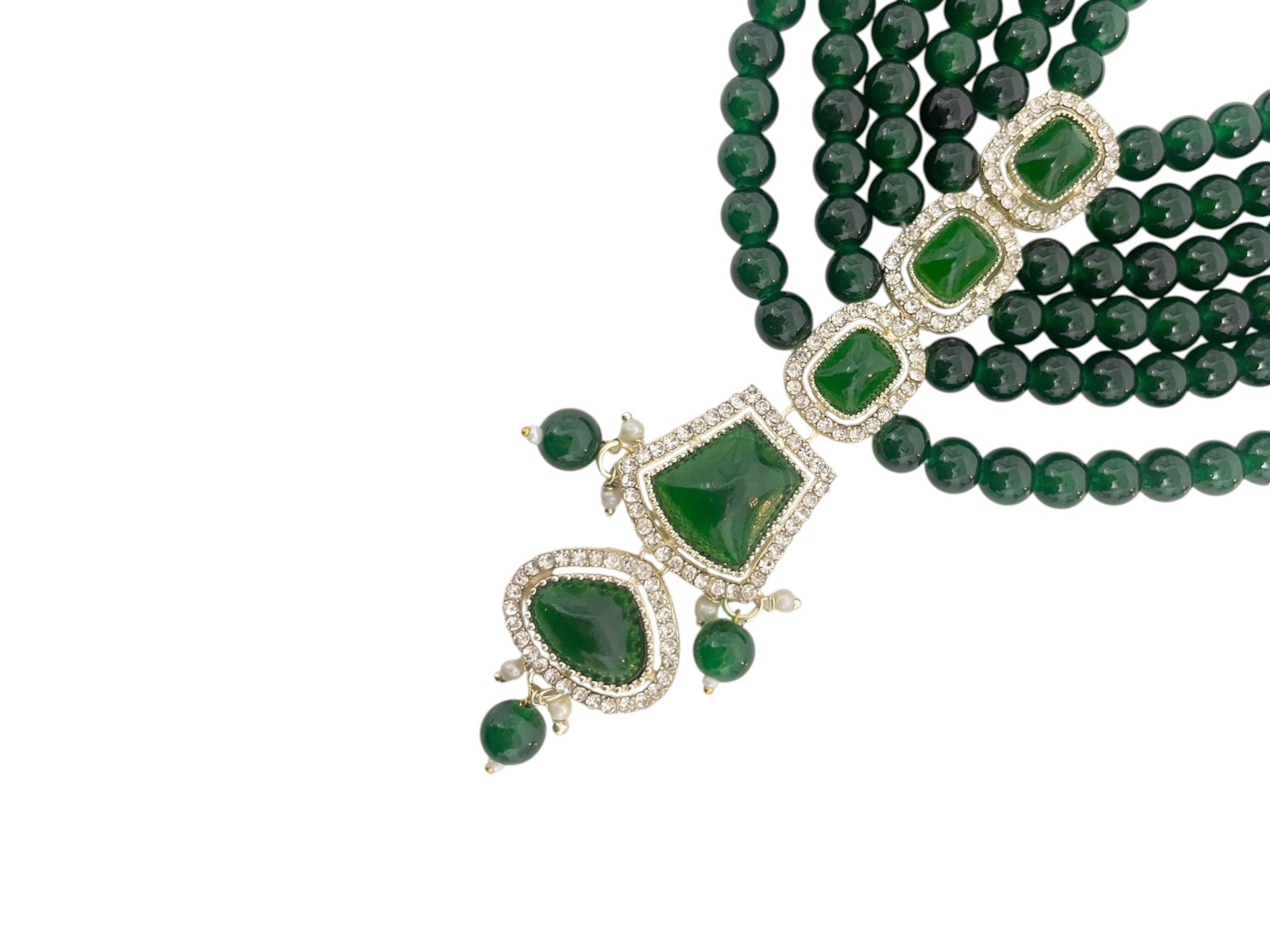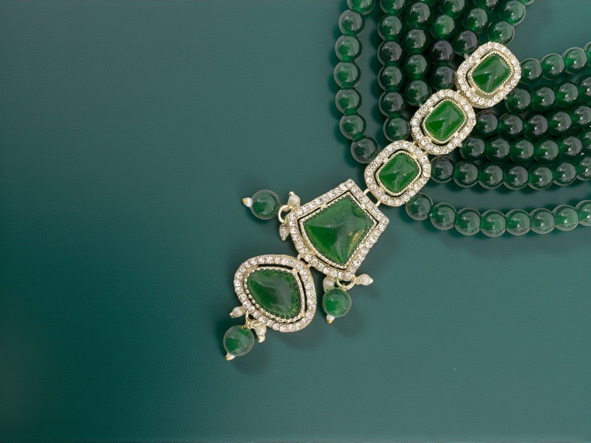 <!--td {border: 1px solid #cccccc;}br {mso-data-placement:same-cell;}-->Elevate the groom’s ensemble with this majestic green beaded groom mala, designed to add royal charm and timeless elegance to wedding attire. Crafted with multiple strands of rich emerald-green round beads, this mala creates a layered, luxurious look that complements sherwani and achkan outfits beautifully.The highlight of the mala is its stunning handcrafted pendant, featuring bold green stones framed with shimmering kundan-style detailing. The structured vertical pendant design adds grandeur while maintaining a balanced, regal aesthetic—perfect for traditional Indian weddings, royal-themed ceremonies, and festive occasions.