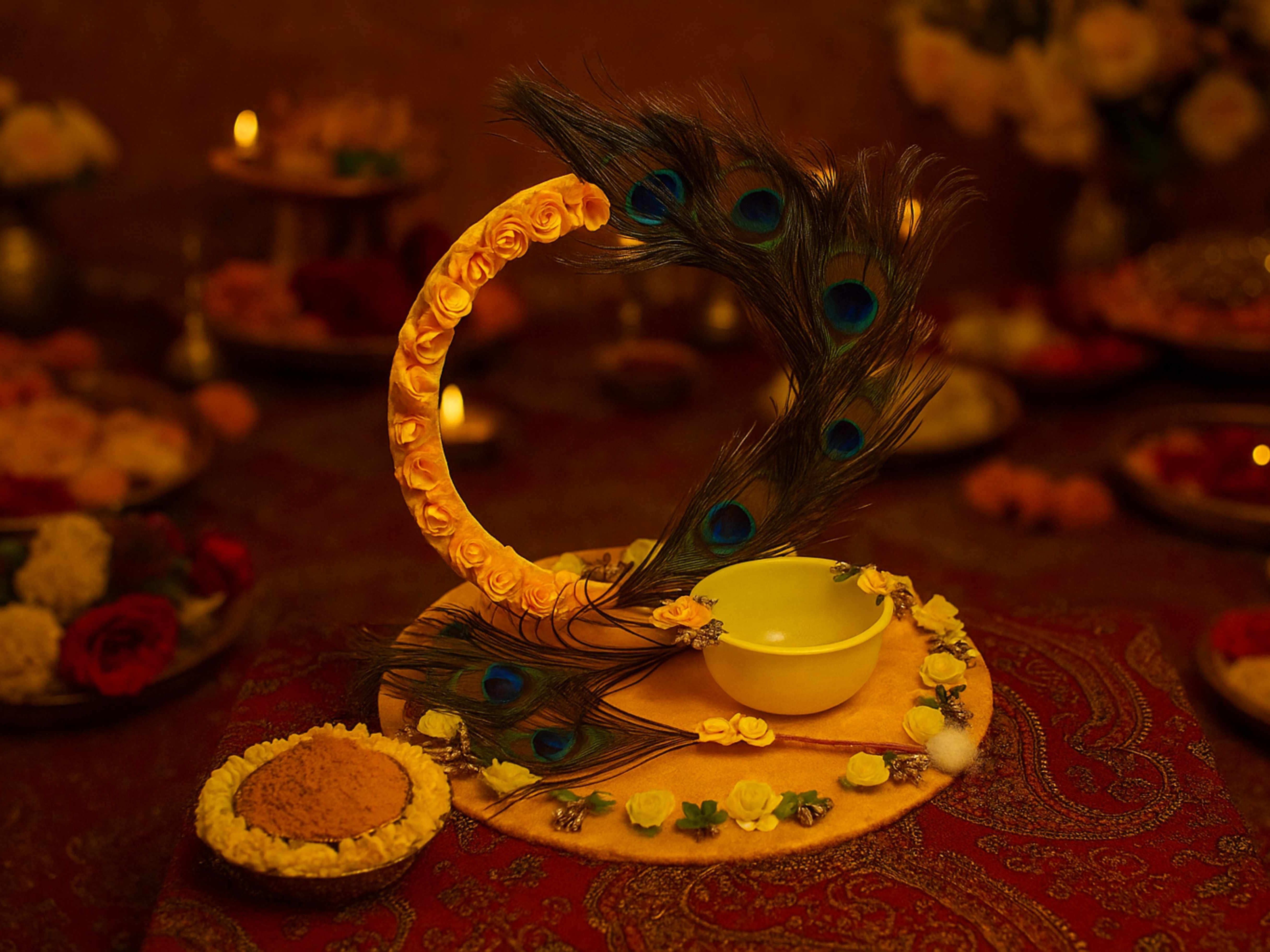 Bring grace and tradition to your Haldi ceremony with this uniquely designed Peacock Feather Hoop Haldi Platter. Featuring an artistic fusion of florals and feathers, this platter offers a modern twist on ritual presentation — ideal for brides and decorators aiming for a royal, aesthetic look.