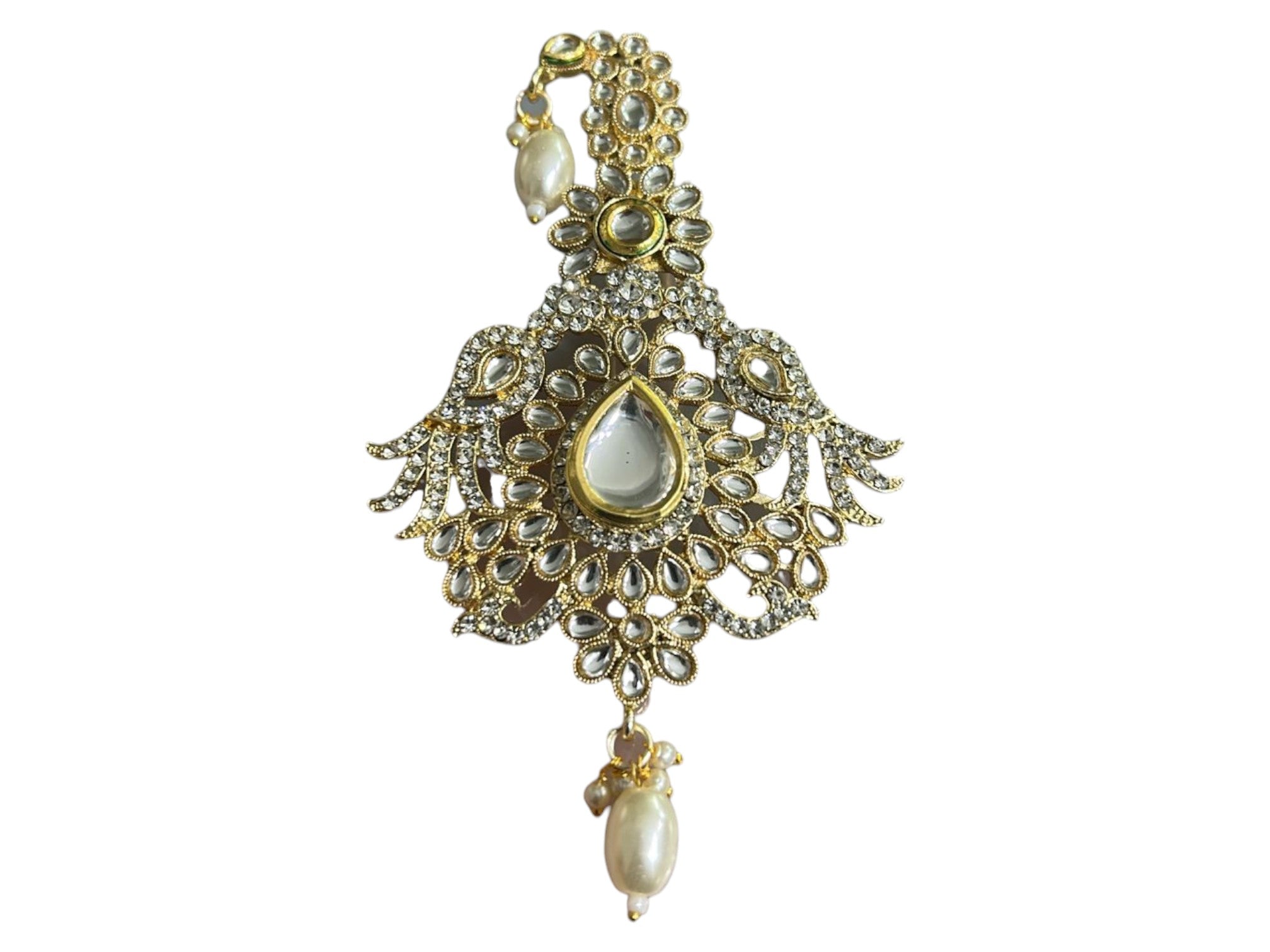 🌟 Key Features💎 Brilliant Crystal Centerpiece: A large, high-quality central crystal creates a luxurious focal point, ensuring unmatched sparkle in photos and wedding lighting.✨ Intricate Stone Work: Surrounded by finely set stones and teardrop crystals that add depth, shine, and an opulent finish.🤍 Elegant Pearl Danglers: Finished with delicate pearl hangings that add traditional charm and graceful movement.🌟 Swan-Inspired Top Design: The curved, rhinestone-studded motif adds a unique and royal flair—perfect for premium groom aesthetics.👑 Gold-Toned Base: A rich gold finish enhances the brilliance of the stones and pairs beautifully with ivory, cream, gold, and pastel pagdis.🎩 Lightweight & Secure: Designed to be comfortable and easy to pin onto any wedding turban.