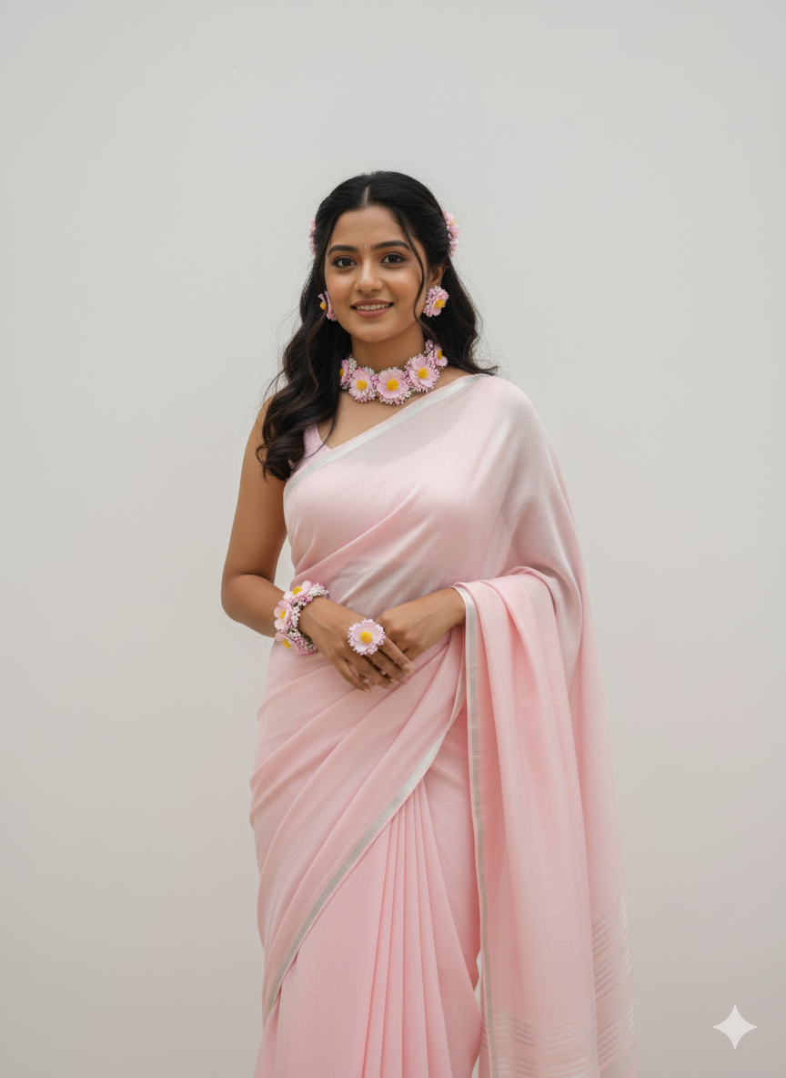Add charm and tradition to your special day with this Petal Ensemble Floral Jewellery Set in pink and white flowers with pearl detailing. Perfect for Haldi, Mehendi, and pre-wedding rituals, this elegant set beautifully complements both ethnic and fusion outfits.