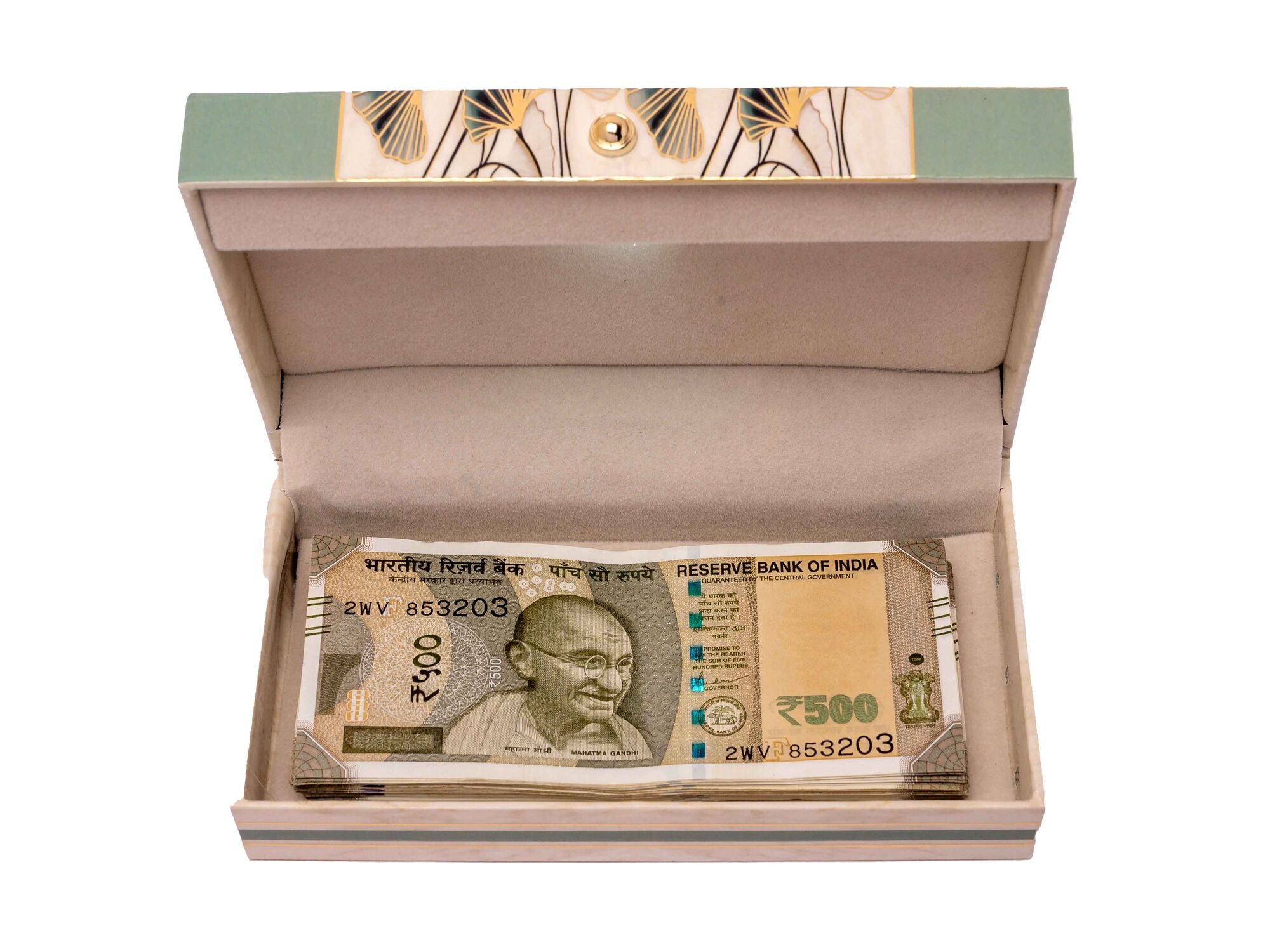 Add a royal charm to your occasions with this maroon zardozi handcrafted cash box. Detailed with golden embroidery and elegant mirror work, it makes your cash gifting classy and memorable for weddings and celebrations.