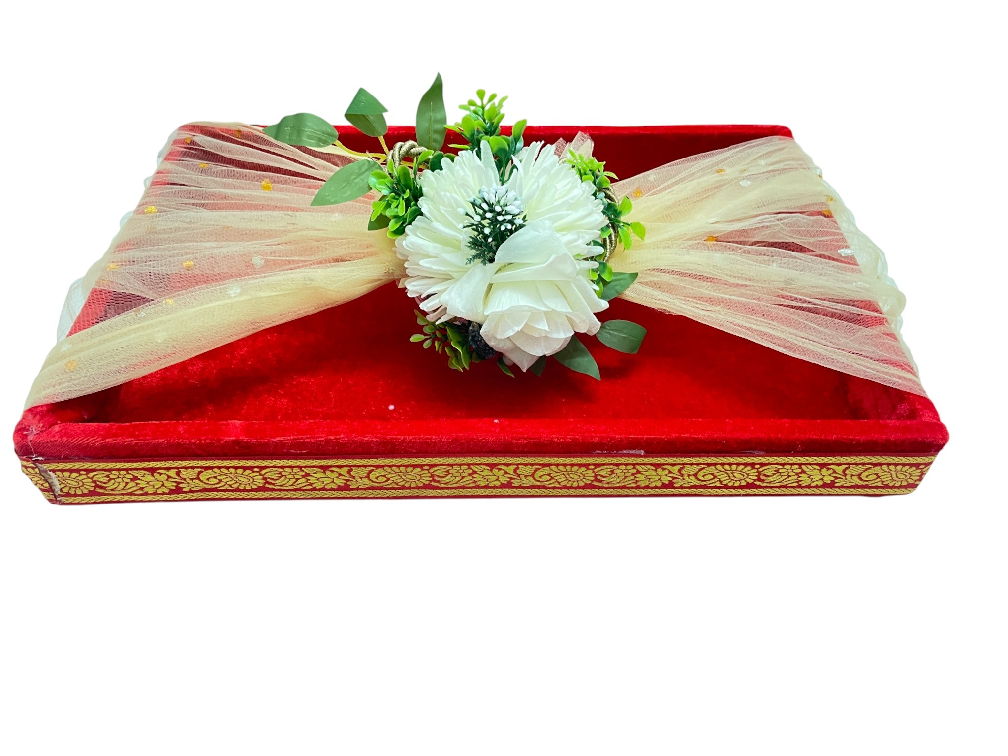 Add an elegant touch to your gifting and wedding packaging with this beautifully crafted velvet packing tray. Designed to enhance presentation, this tray features a rich red velvet base paired with a delicate floral belt for a luxurious look.
