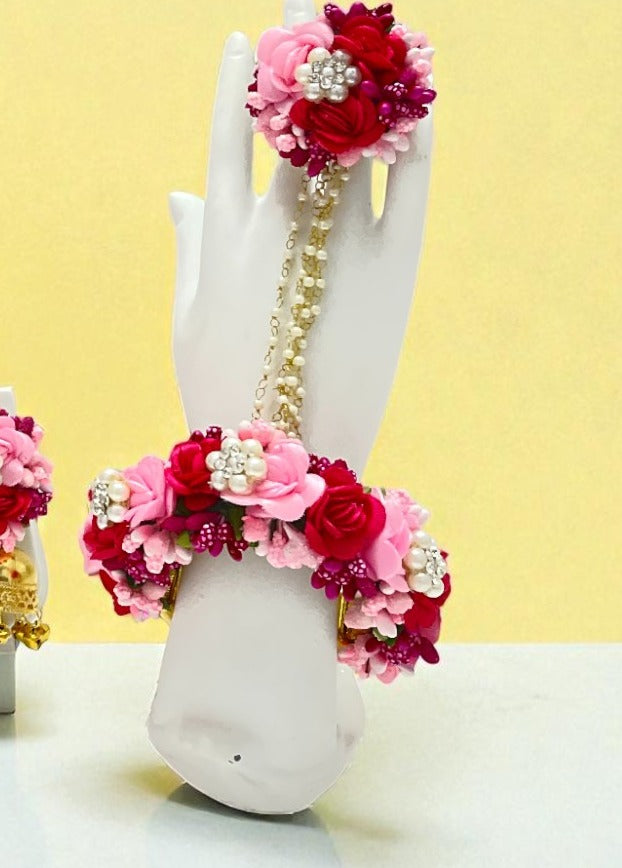 Shine at your pre-wedding functions with this Radiant Floral Jewellery Set, designed in light and dark pink artificial flowers with pearl embellishments. Ideal for Haldi, Mehendi, or festive ceremonies, this set gives brides an elegant yet vibrant appeal.