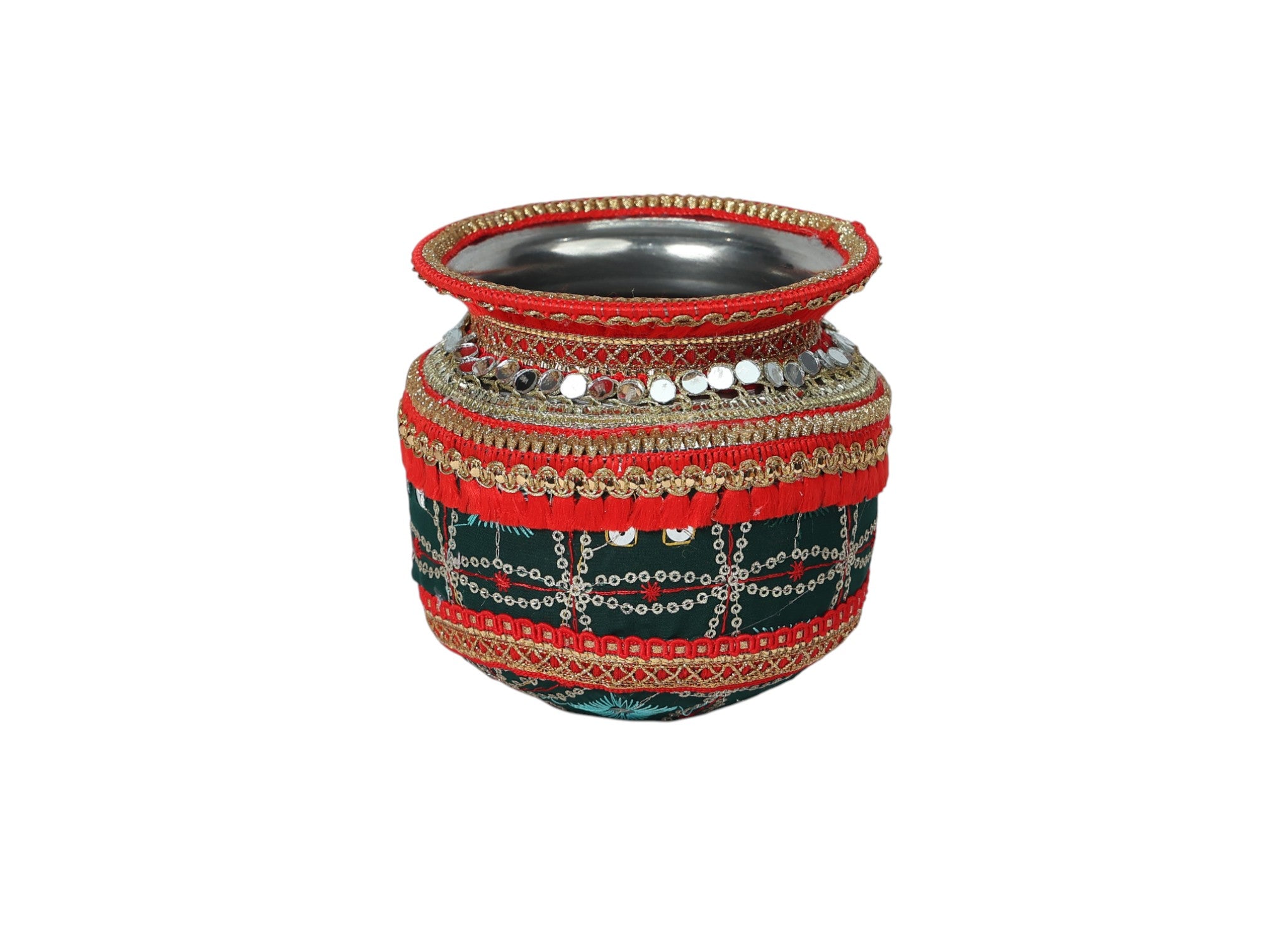 Add elegance and tradition to your celebrations with this Decorated Steel Pooja Lota, a perfect blend of utility and Indian craftsmanship. Wrapped in rich green fabric, the lota features mirror-like bead work, intricate zari embroidery, and vibrant threadwork arranged in symmetrical, ethnic patterns.