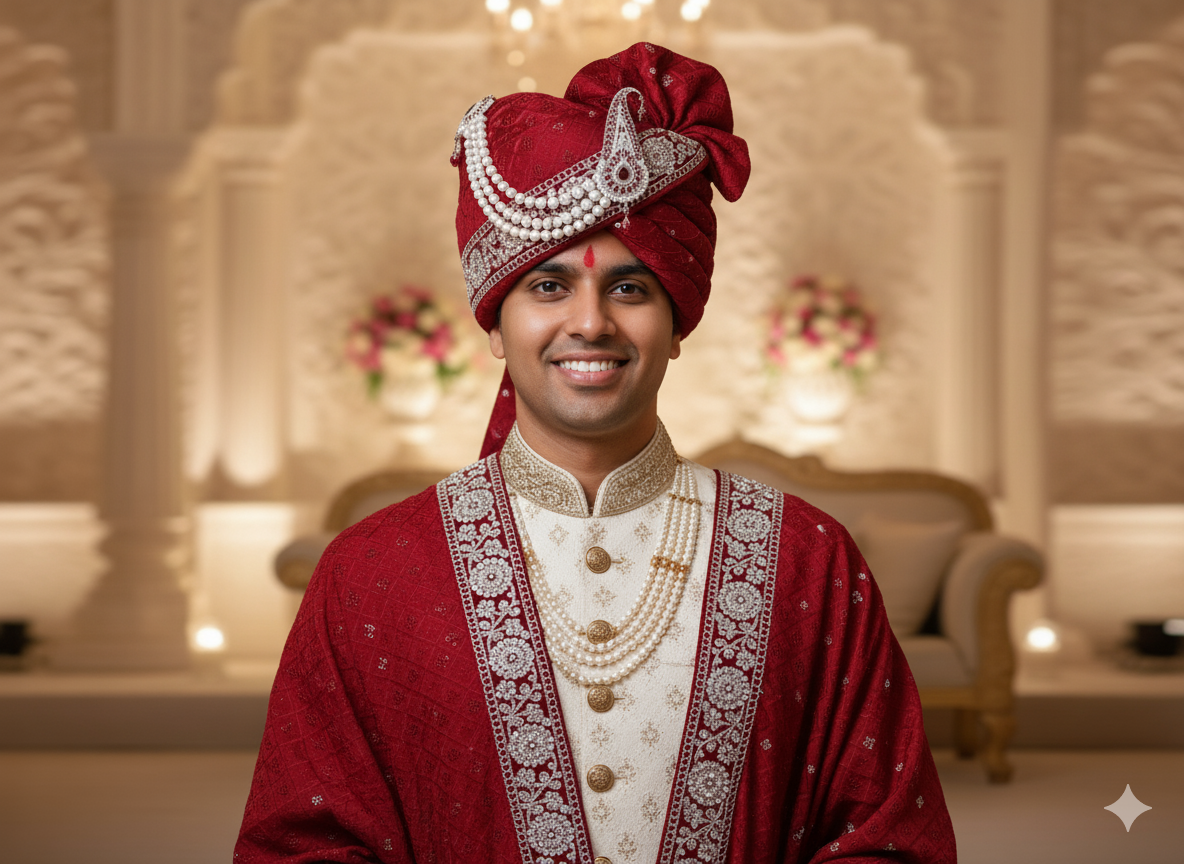 Make a bold statement with this royal maroon groom pagdi paired with a matching embroidered safa. Crafted with rich detailing, the ensemble is enhanced with a pearl and stone dulha kalgi, giving it a regal finish. Ideal for grooms wearing traditional sherwanis, this pagdi ensures a complete royal wedding look.