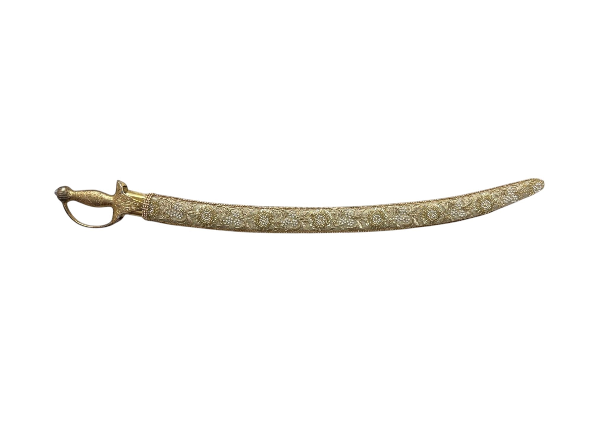 Step into regal elegance with this stunning Royal Groom Talwar, crafted to bring a majestic touch to traditional Indian weddings and grand ceremonies. Featuring a beautifully engraved golden hilt and a curved steel blade, this Talwar exudes timeless grandeur. The sheath is elegantly hand-embellished with pearl and sequin detailing, making it an exquisite accessory for grooms or ceremonial décor.