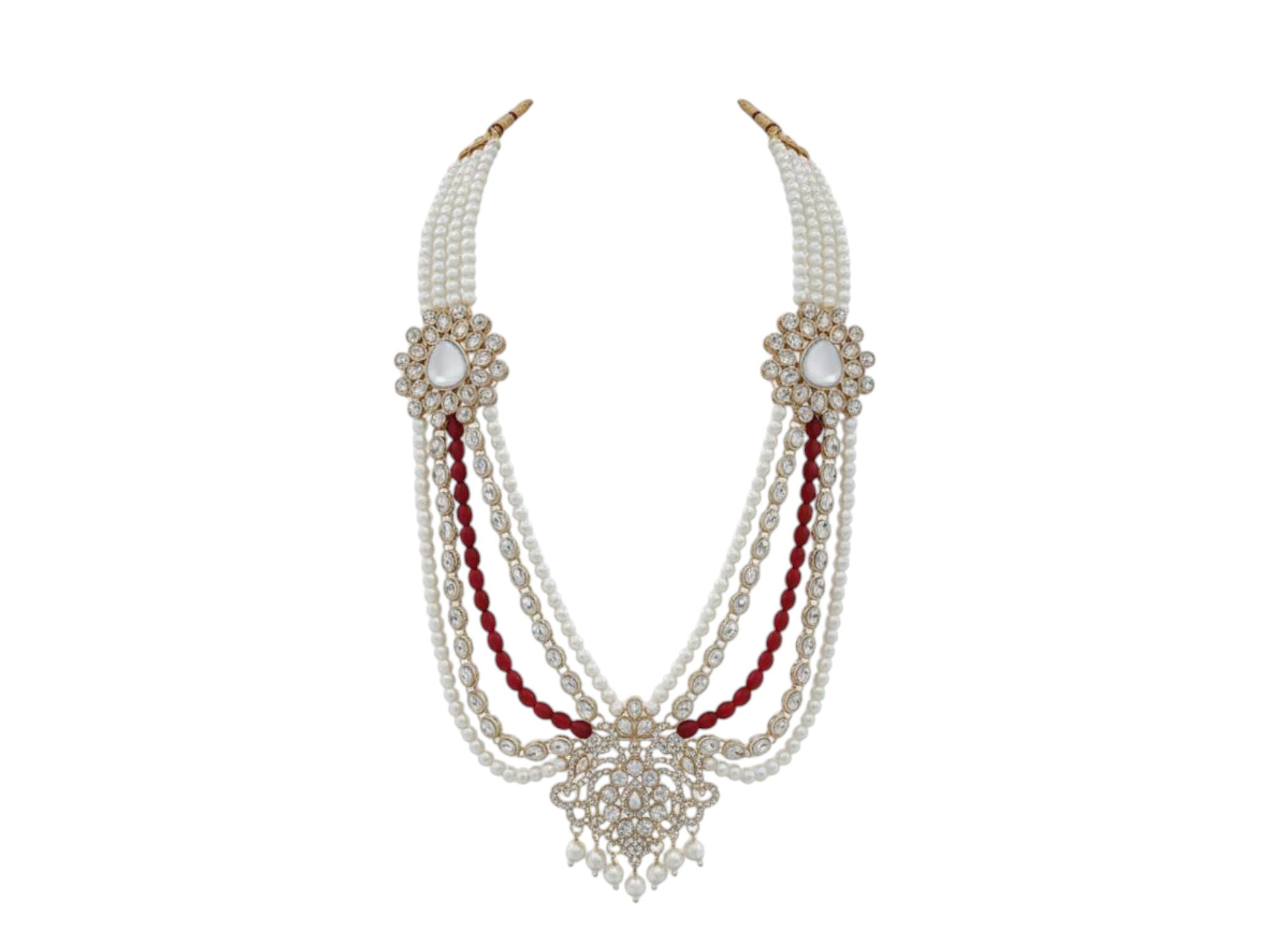 Elevate your wedding look with this royal multi-layer groom mala, blending traditional charm with regal sophistication. Crafted with lustrous pearls, rich maroon beads, and sparkling kundan stones, this designer mala features two elegant side motifs and a statement central pendant that adds unmatched grandeur.