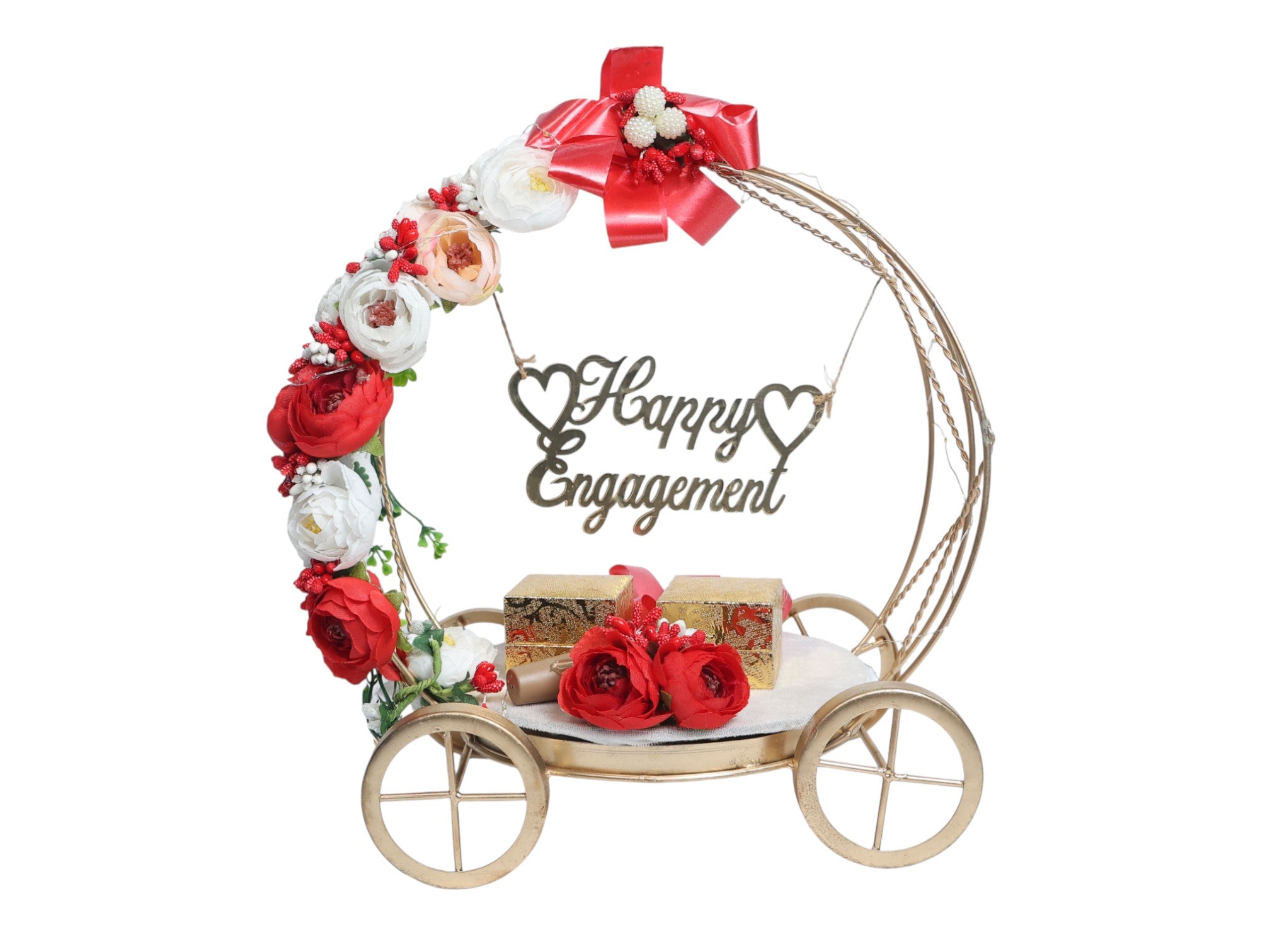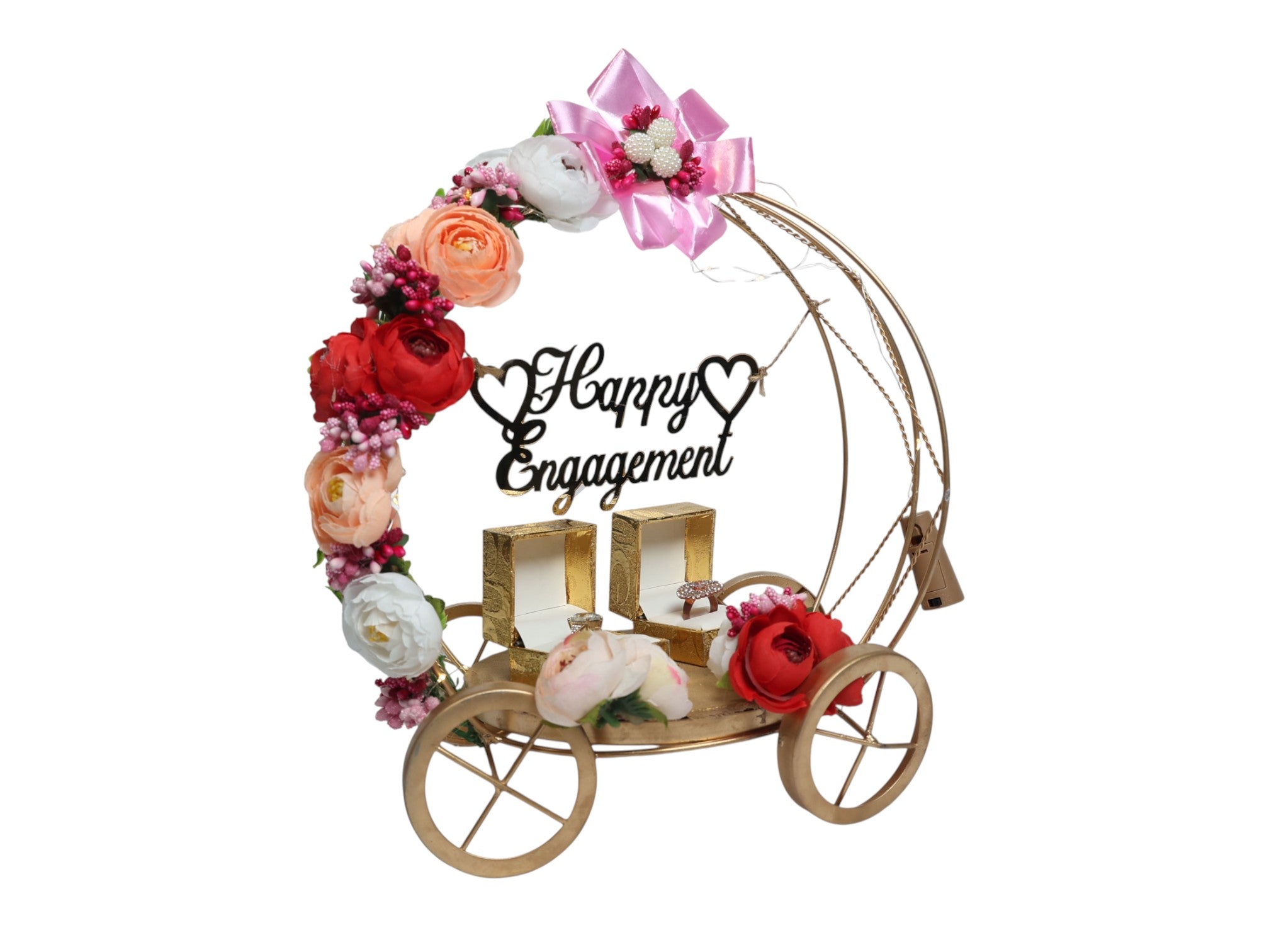 Add a fairytale charm to your engagement ceremony with this stunning carriage-themed ring platter. Designed like a delicate vintage cart, this unique piece features a golden wheelbase, an elegant floral arrangement with roses and peonies, and a clear acrylic ring with a graceful “Happy Engagement” message.