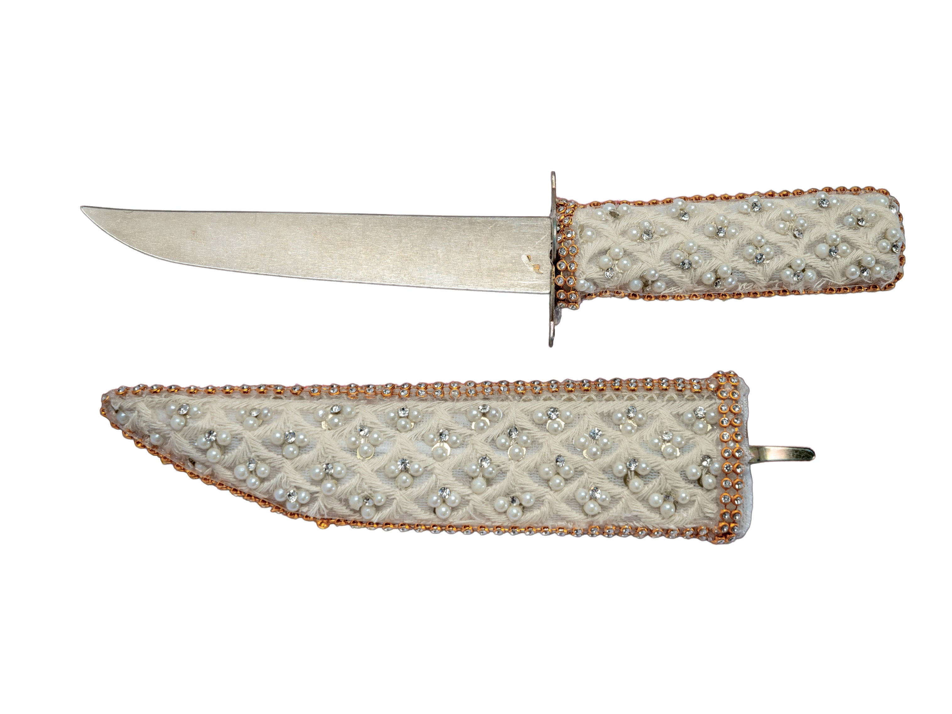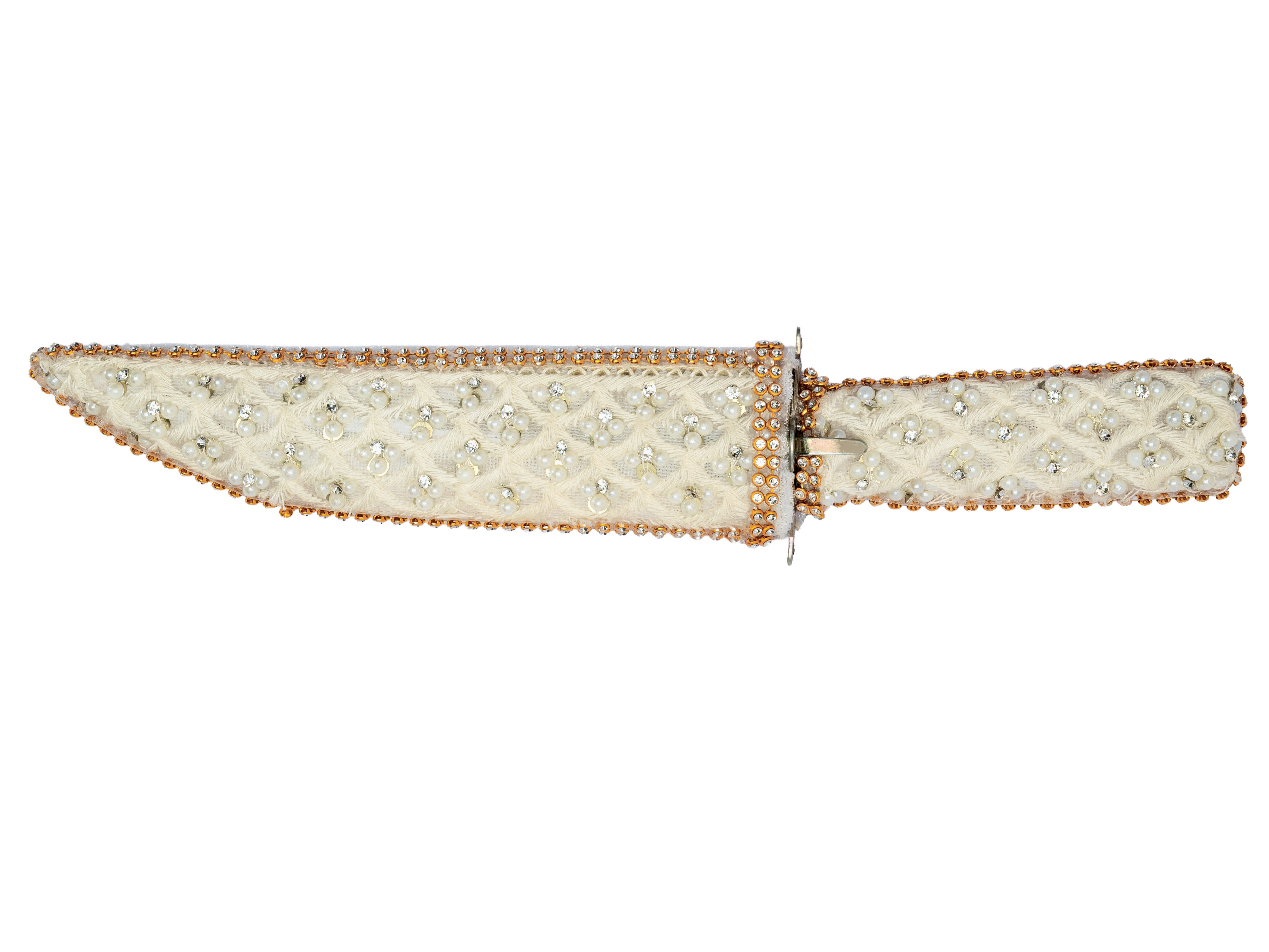 A golden lace or pearl trim along the edges adds to its grand appeal, making it the perfect accessory to complement your sherwani, bandh gala, or royal-themed attire. Whether carried during the baraat, varmala, or wedding photoshoot, this ceremonial kataar enhances your look and makes for a cherished keepsake from your big day