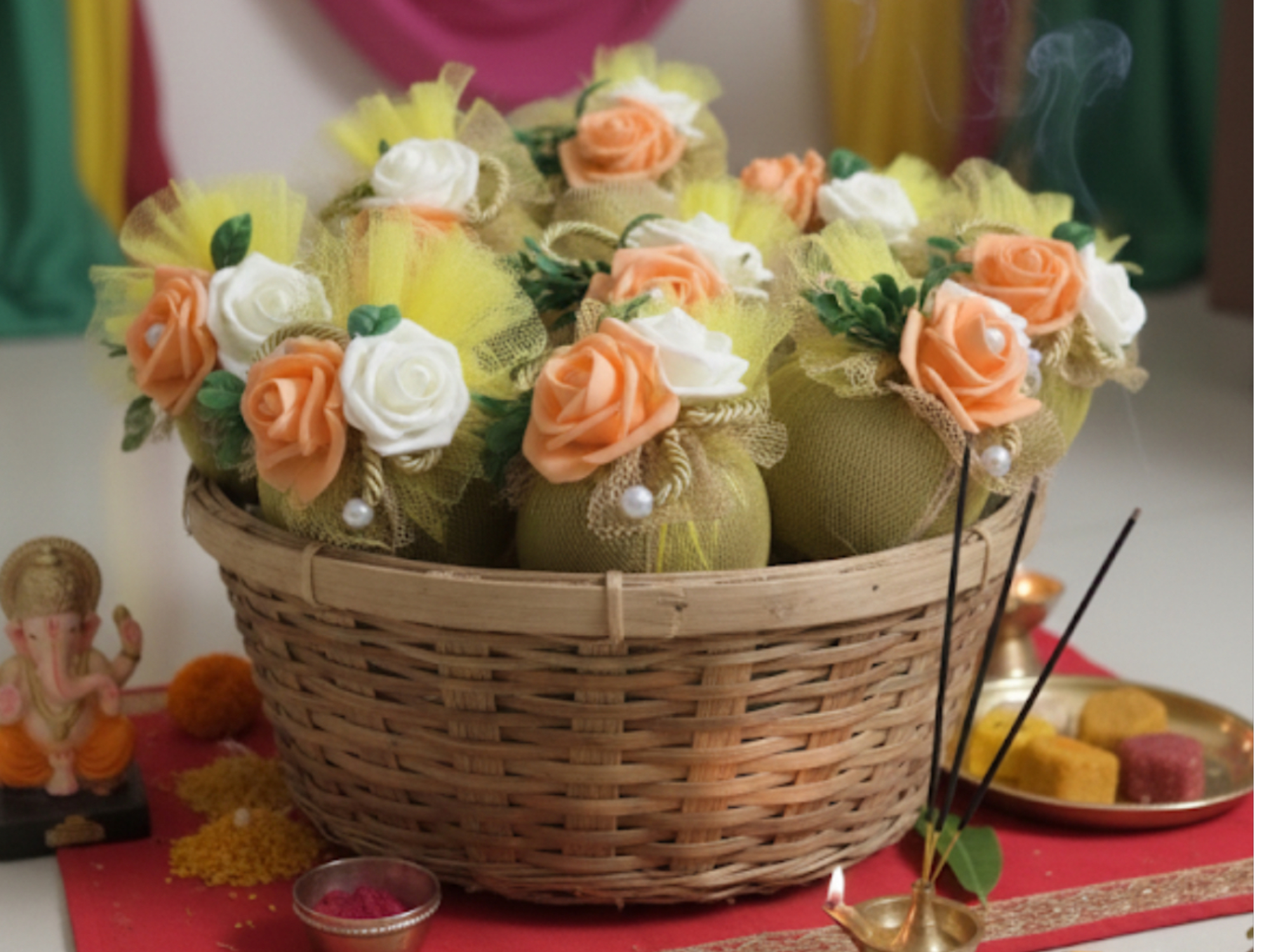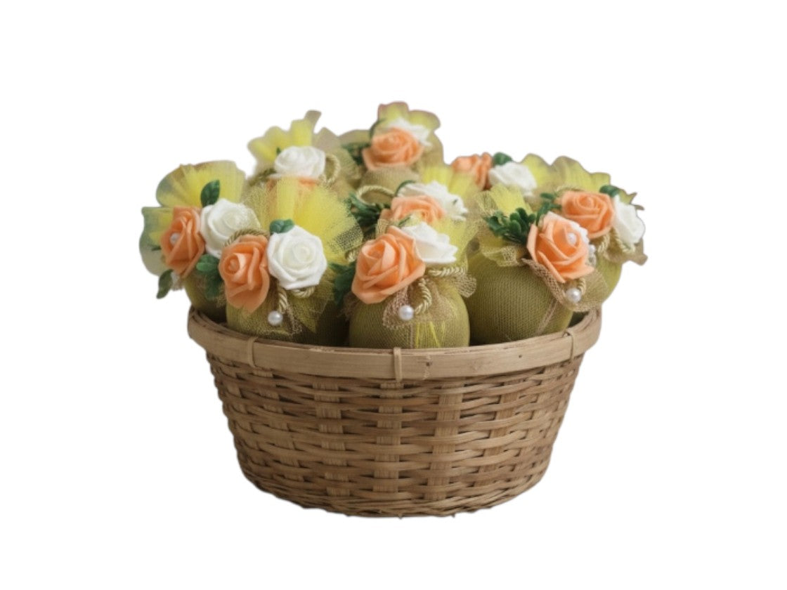 • Decoration: Artificial flowers, pearls, net fabric & golden detailing