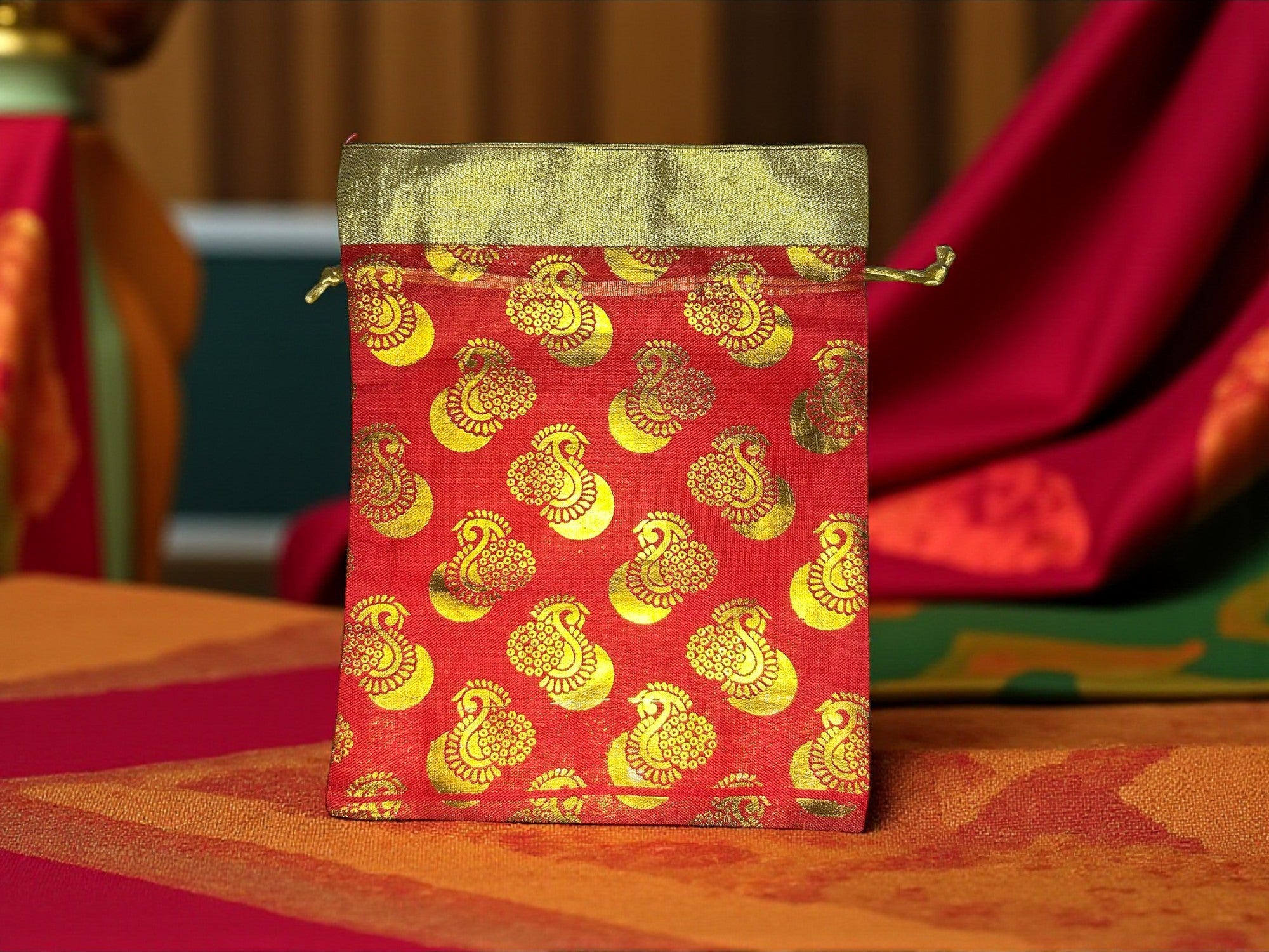 Add a touch of elegance to your ethnic look with this vibrant red and gold brocade potli bag. Crafted with rich fabric and adorned with intricate golden peacock motifs, this potli is the perfect blend of tradition and style. The shimmering golden drawstring closure ensures both security and charm, making it ideal for festive occasions, weddings, parties, or gifting.